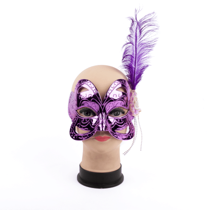Antifaz de plástico resistente, con plumas y mullos, viene con cinta de tela para ajustar y una flor de tela. Medidas 13 cm alto, 16 cm largo y pluma 17 cm