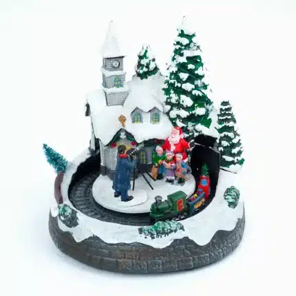 Adorno musical, con escena de niños posando con Santa Claus al fotógrafo cy movimiento giratorio de un tren, incluye luces, movimiento y música.