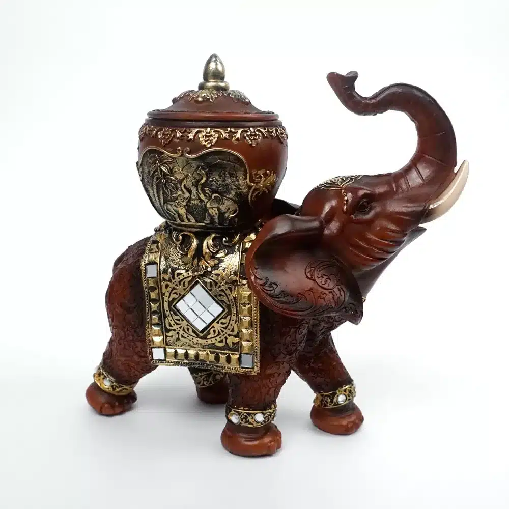 Adorno de elefante en poliresina, de color marrón con detalles dorados.