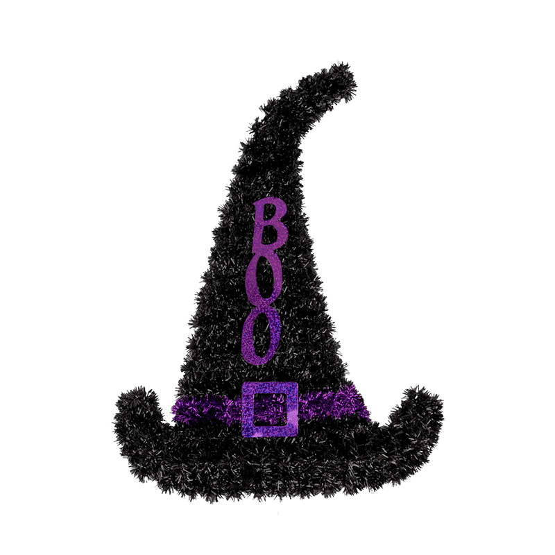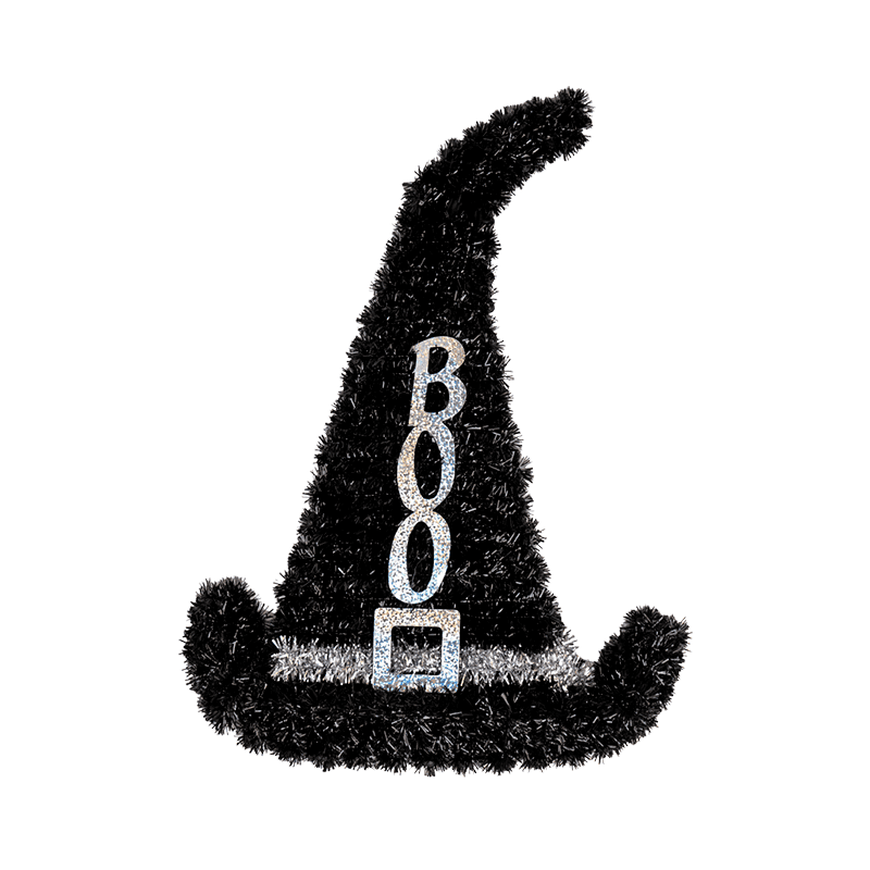 Adorno colgante, en forma de sombrero de bruja con palabra BOO en 2 colores