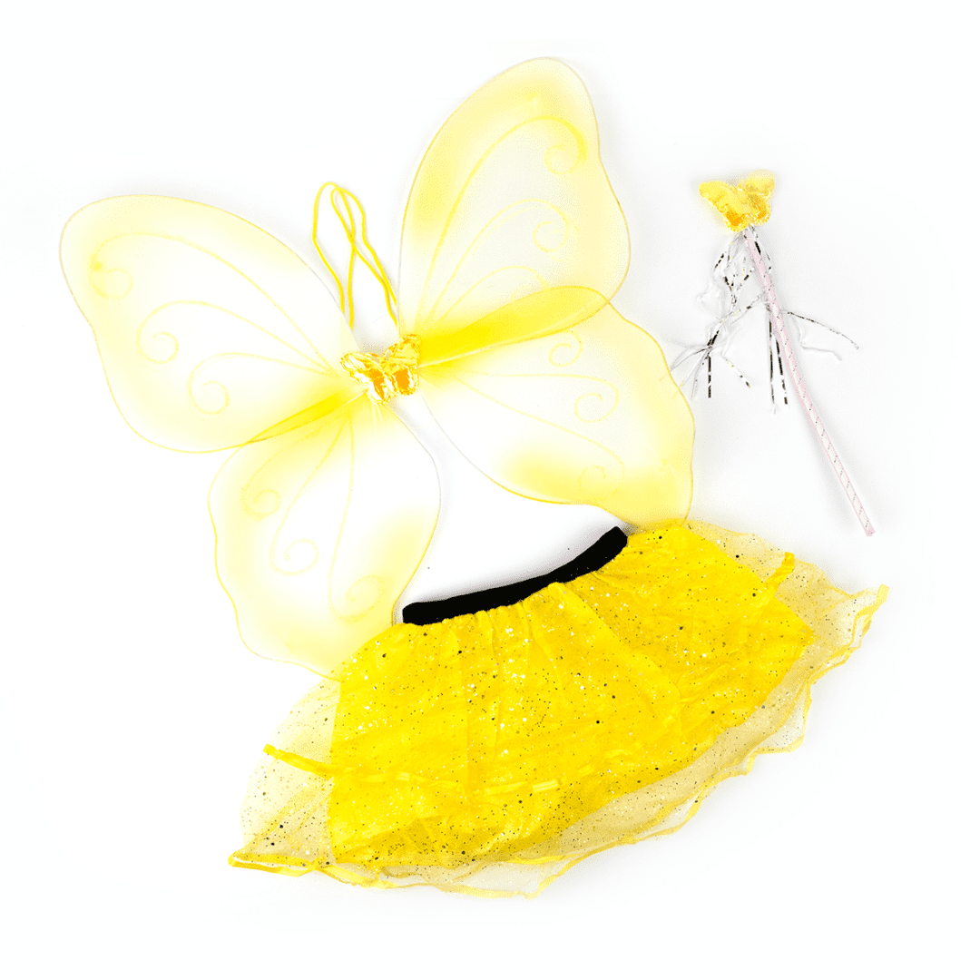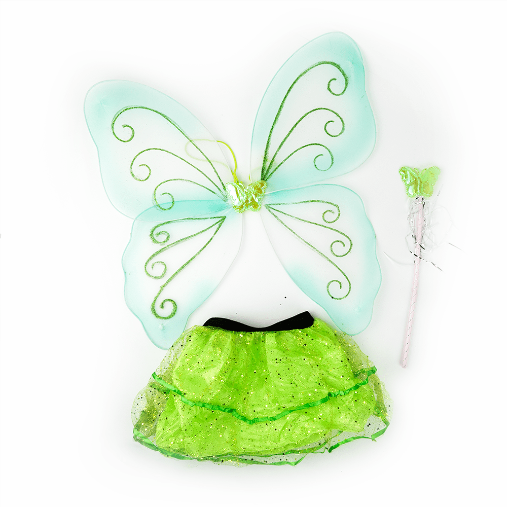 Conjunto de disfraces de niña incluye alas de mariposa, varita mágica, diadema y falda de tutú.
