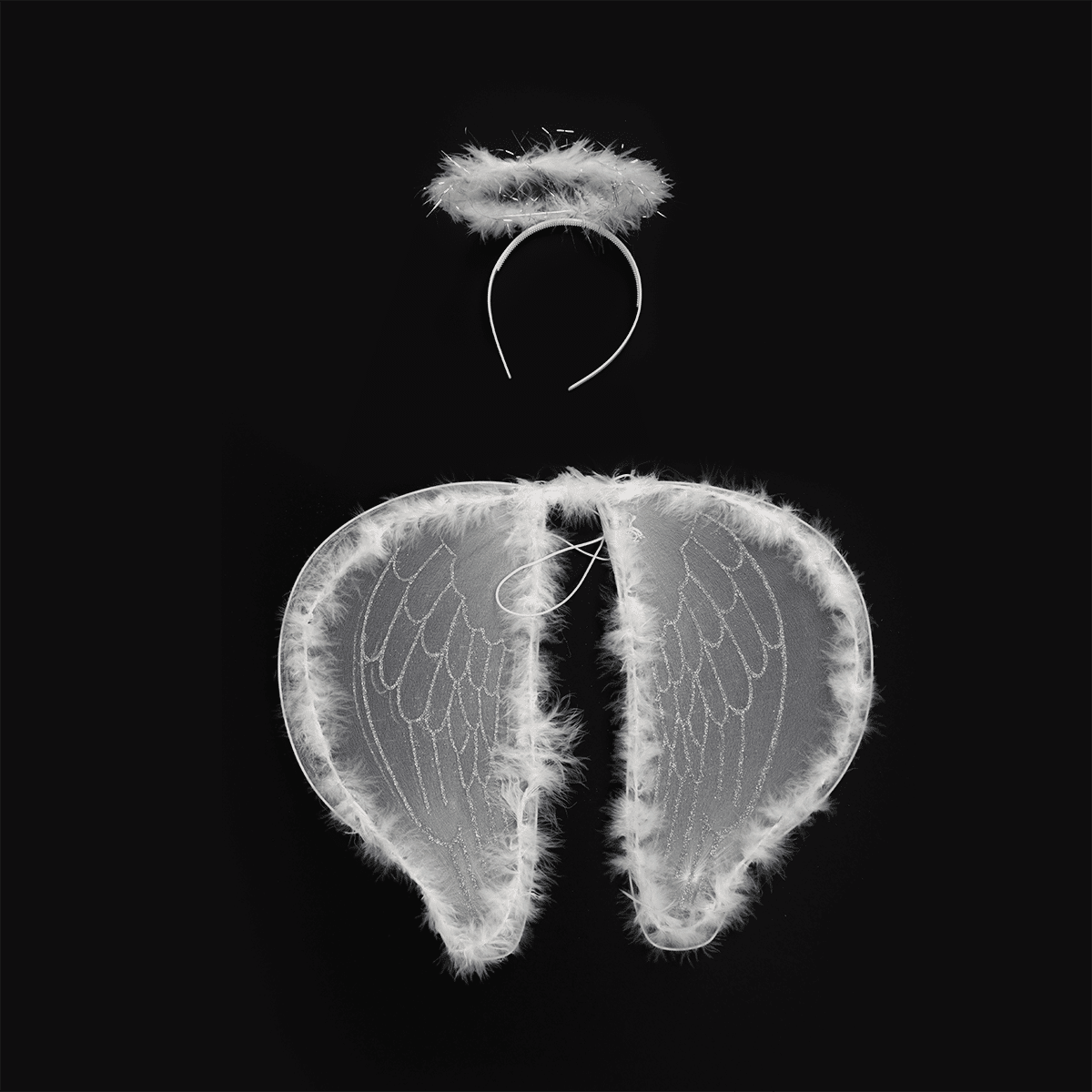 Set de accesorios de disfraz de angel con daidema de aureola y destellos de brillo y escarcha.