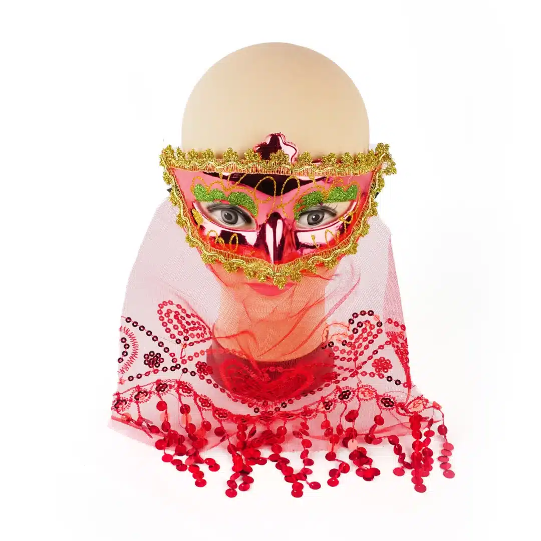 Antifaz de plástico resistente, con velo bordado en lentejuelas, encaje en los borde y cinta de tela para ajustar. Medidas 34 cm de largo x 18 cm de ancho