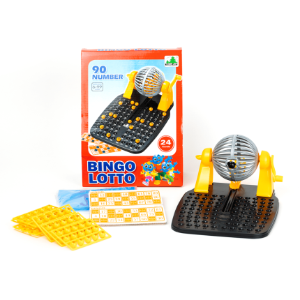 Set completo de Bingo, Bolillero, 24 tarjetas con números, 90 números en bolitas, organizador de bolas, fichas para marcar.