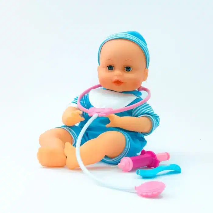Muñeco mecánico que mueve su cabeza y brazos mientras tose y se ilumina rostro de color rojo, Palpita el corazón cuando se pone el estetoscopio en el pecho del muñeco, simula comer cuando se le pone la cuchara en la boca, bebé llora cuando se le inyecta. Peso del muñeco en caja de 1KG, Muñeco de 37cm de alto, utiliza 3 pilas AA,