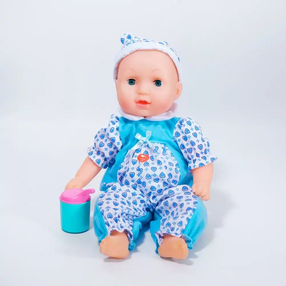 Muñeco mecánico que al reírse mueve cabeza, simula roncar, presiona su mano y dice «mami te quiero a ti», incluye biberón para el muñeco. Peso del muñeco en caja 1 KG, Muñeco de 37 cm de alto, utiliza 3 pilas AA,