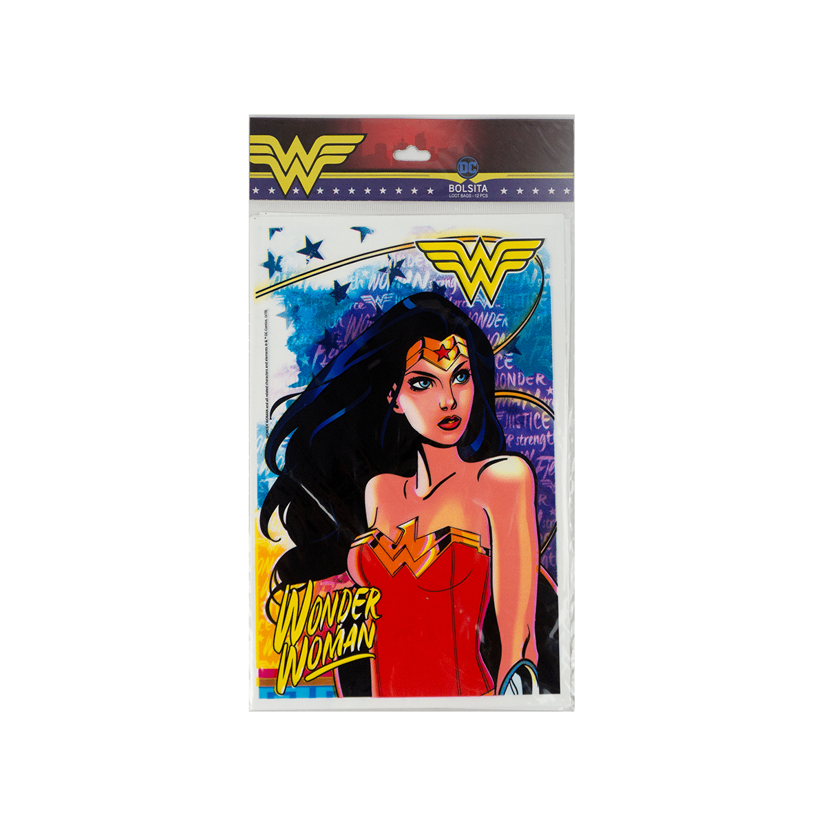 Bolsa para la piñata de plastico con Tematica de Wander Woman 12 unidades.