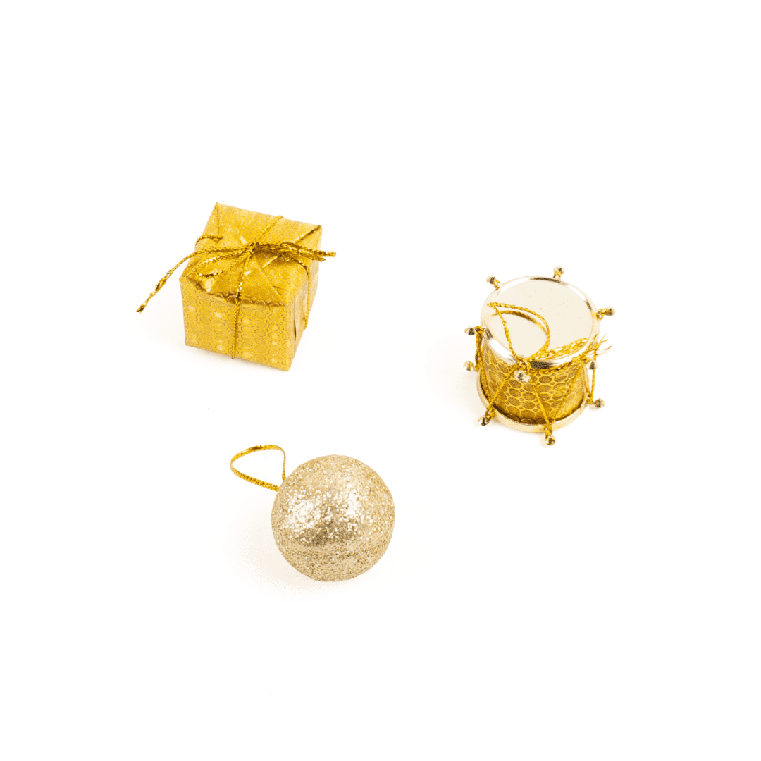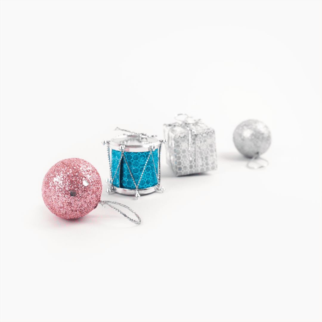 Set de bombillos mixtos de navidad de 13 unidades con distintos diseño como: Tamborin, bombillo escarchado, y caja de regalo.