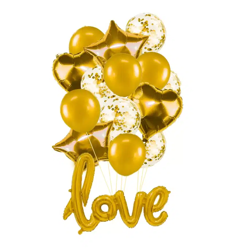 Set de globos 15 unidades con 1 globo love , 2 metalizado en forma de estrella y 2 globos metalizados en forma de corazón, y 5 globos color rojo y 5 globos con lentejuelas internas.