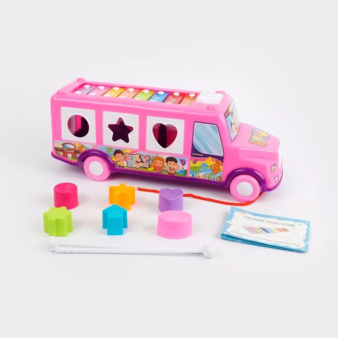 Bus escolar musical con xilófono, 8 teclas de colores vibrantes y enumeradas.