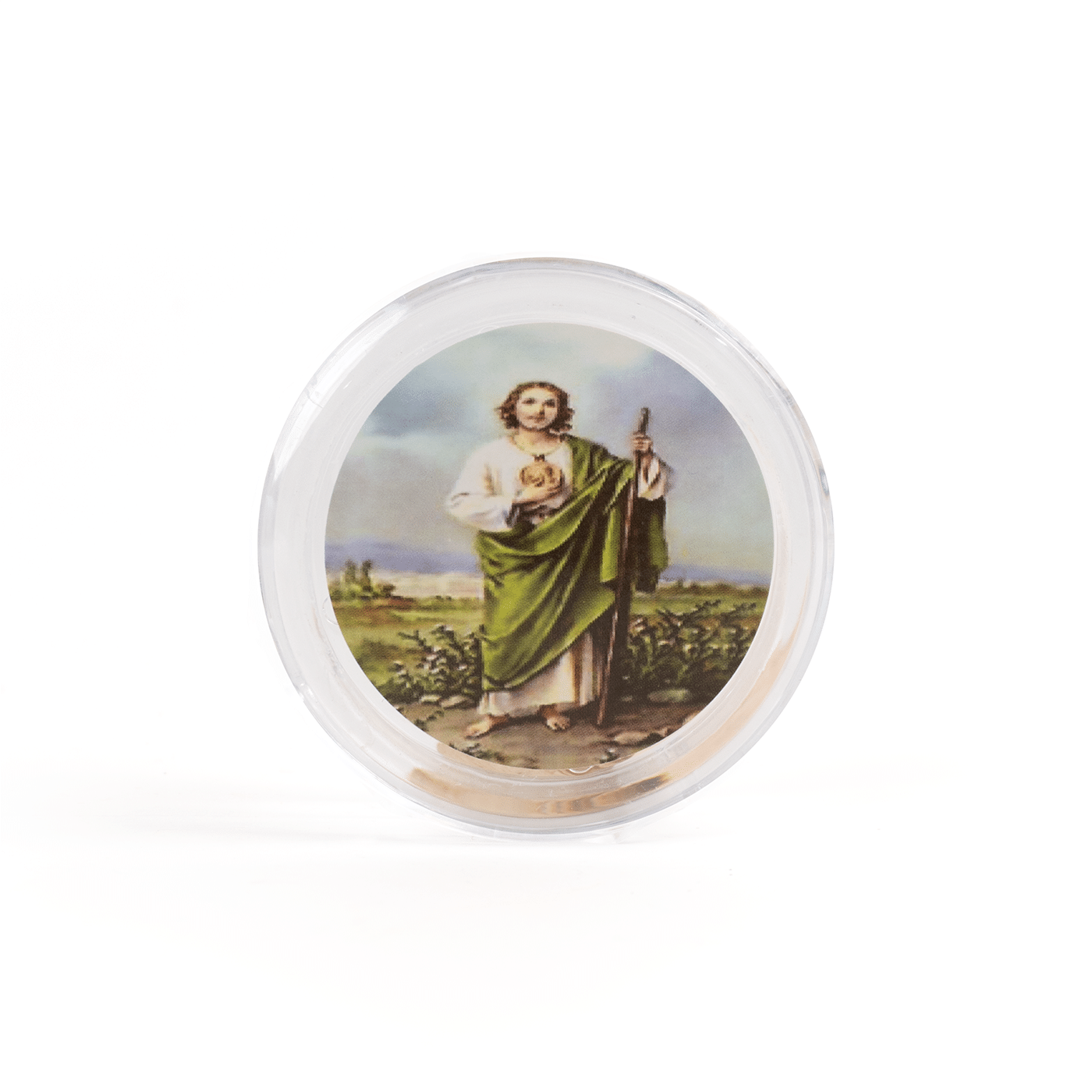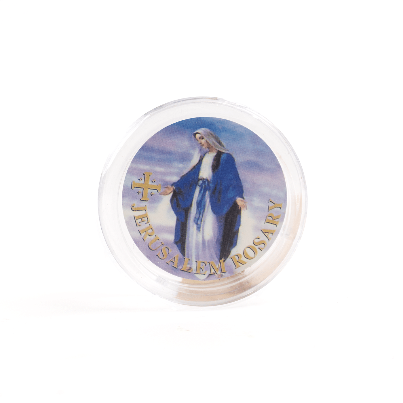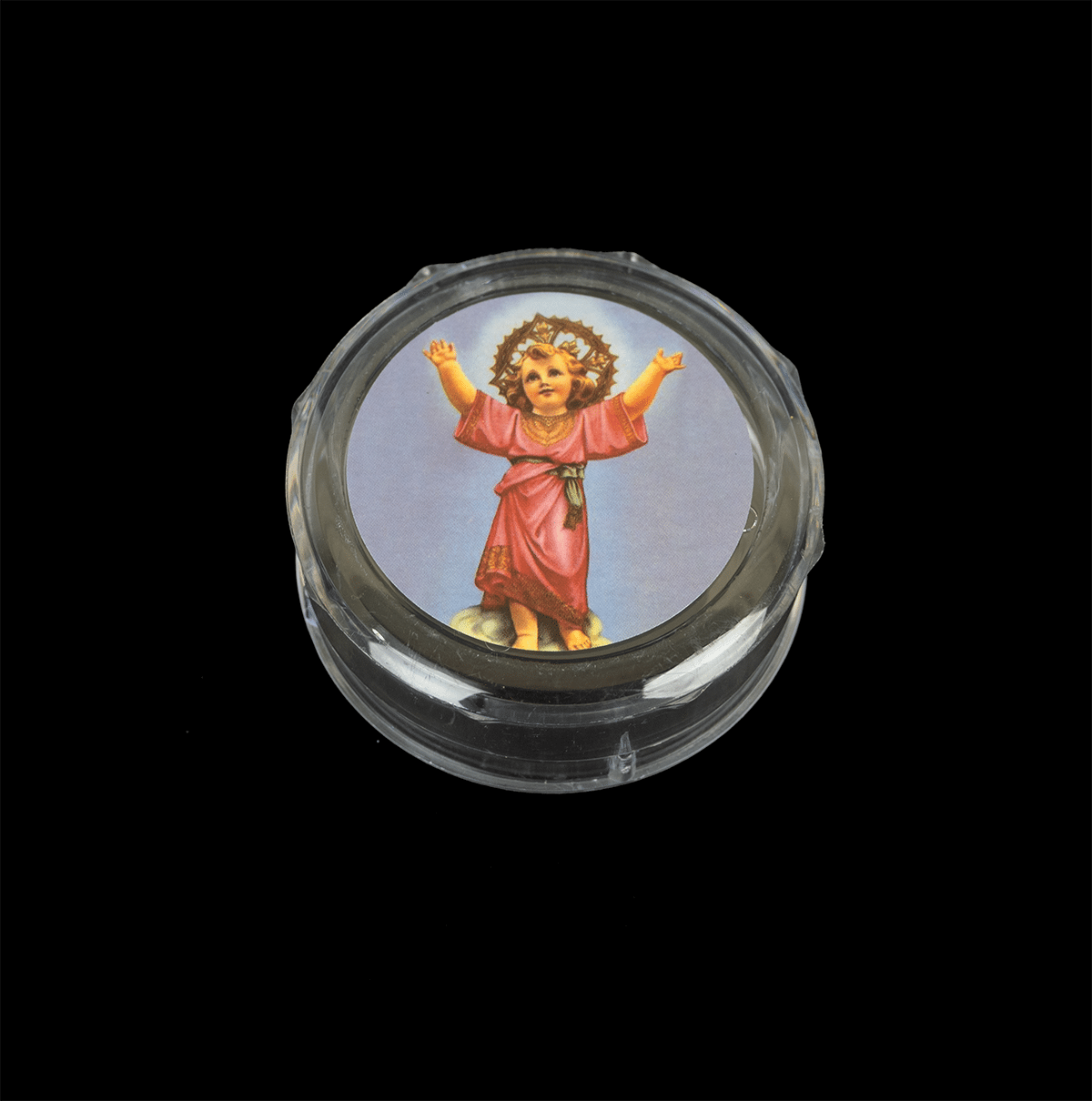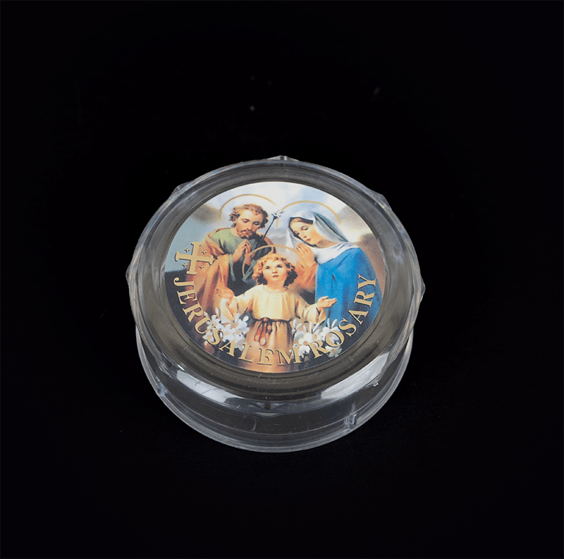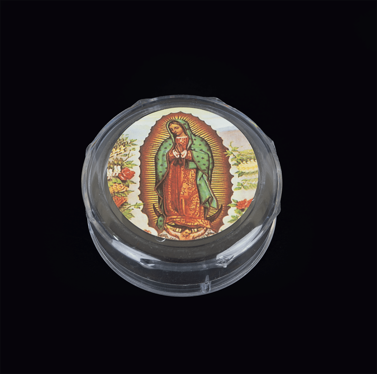 Caja circular de acrilico transparente con imagenes religiosas como: Virgen María, Niño Jesús.
