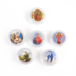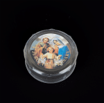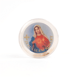 Caja circular de acrilico transparente con imagenes religiosas como: Virgen María, Niño Jesús.