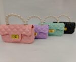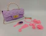 Elegante bolso infantil color lila con acabado brillante y cadena dorada. Incluye accesorios de belleza como espejo, peine, pulsera y broches para el cabello. Perfecto para que las pequeñas se diviertan y den rienda suelta a su imaginación.