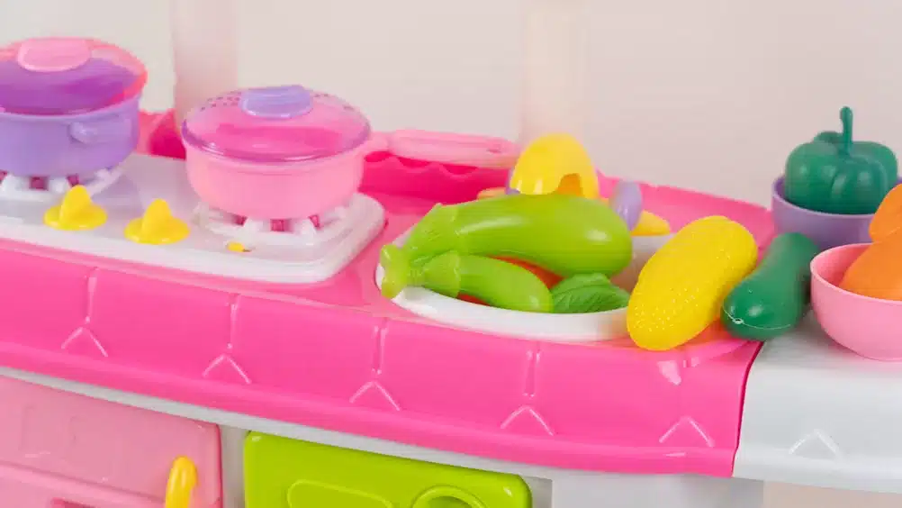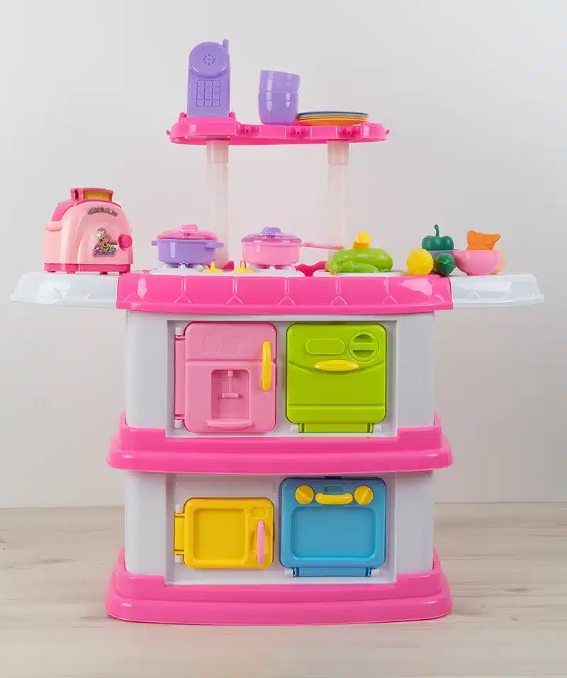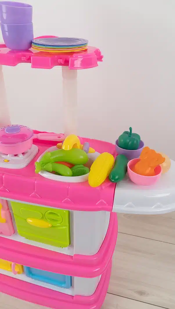 Dimensiones: 37 cm largo x 17 ancho x 60cm alto. Set juego de cocina contiene 18 piezas separadas para armar. incluye: 1 tostador, 2 panes plásticos, 8 verduras, 1 sartén 1 olla, 5 platos planos 2 platos hondo 2 tazas para té 2 cartones de leche y un set de calcomanías para darle el toque final a tu cocina.