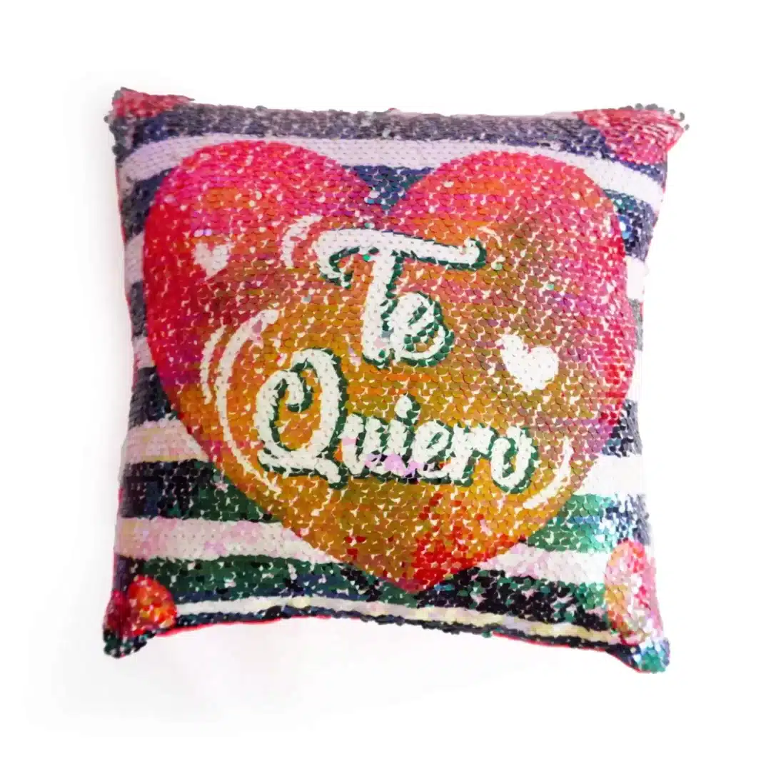29 cm largo x 25 cm ancho, almohada con lentejuelas reversible con la palabra (Te Quiero). Desliza tus dedos a través de la lentejuelas, puedes obtener un color diferente.