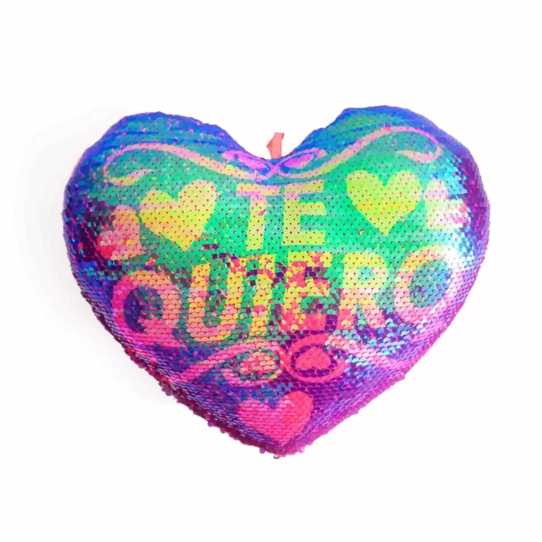 28 cm largo x 30 cm ancho almohada en forma de corazón con lentejuelas reversible con la palabra (te quiero). desliza tus dedos a través de la lentejuelas, puedes obtener un color diferente.