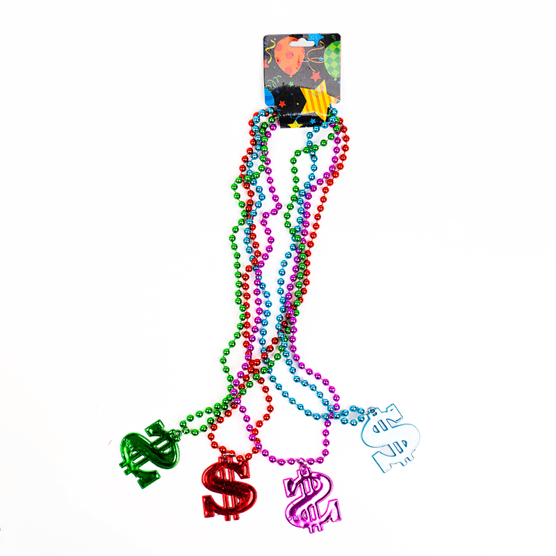 Set X 4 collares de bolitas de plastico de colores cromados con signo de dólar.