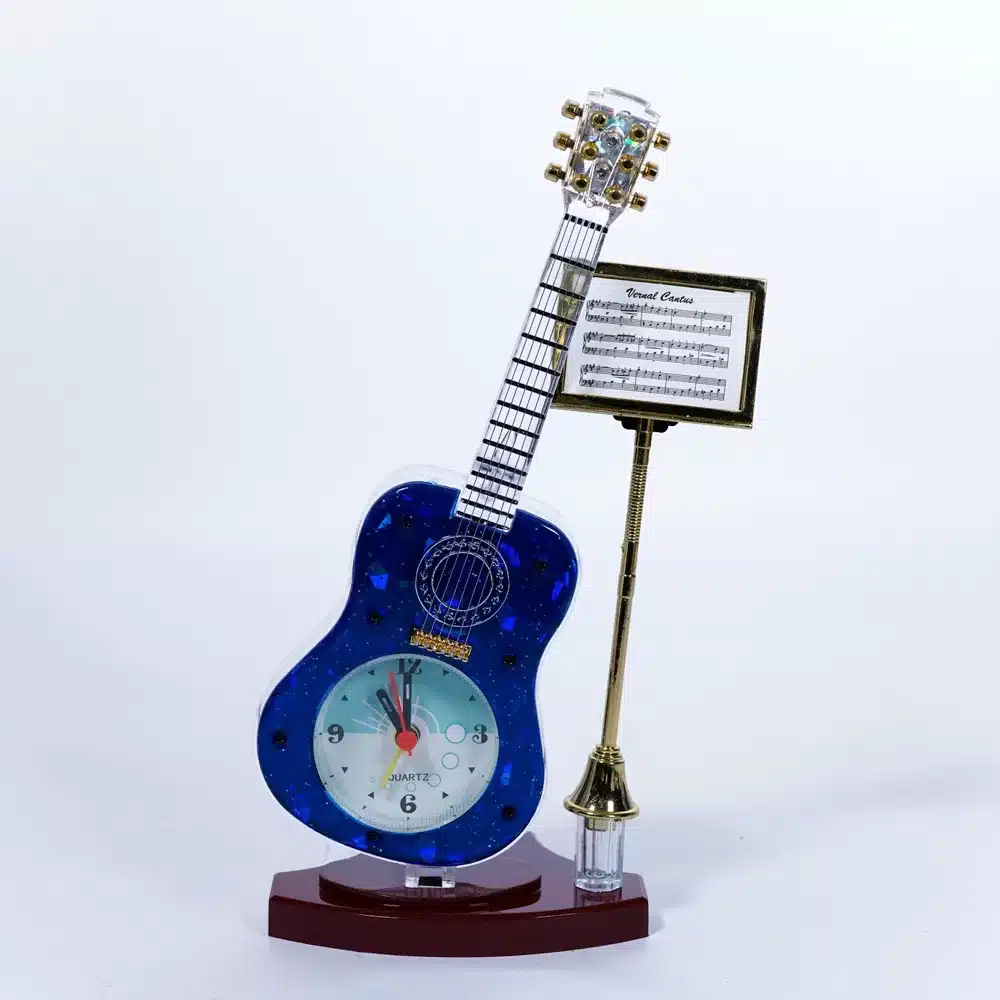 Elegante reloj despertador con forma de guitarra, ideal para adorno de oficina o para el hogar.