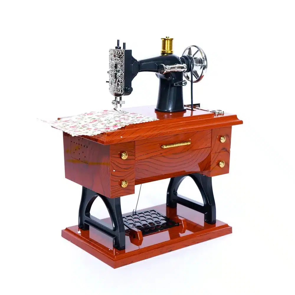 Joyero, al abrir la gaveta de la máquina de coser emite musica y movimientos. utiliza pilas 2xAA ( NO INCLUYE). Dimensiones:25 cm largo x 14cm ancho x 32 cm alto peso: 600 gramos