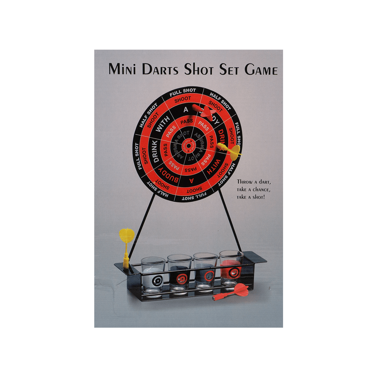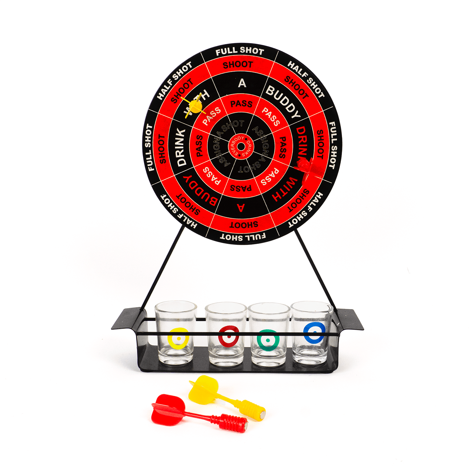 JUEGO DE DARDOS CON SHOTS CUENTA CON 4 SHOTS 4 FLECHAS MAGNETICAS mEDIDAS: 27CM DE ALTO X 21CM DE LARGO MEDIDAS DE SHOTS 4.5CM DE ALTO ELABORADO EN METAL