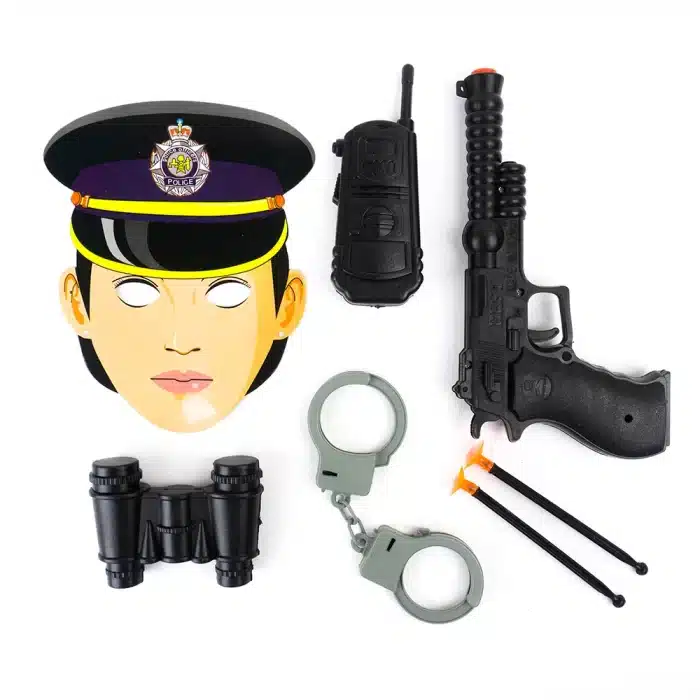 Incluye: 1 careta, 1 binoculares, 1 esposas, 2 dardos, 1 pistolas y 1 woki toki.