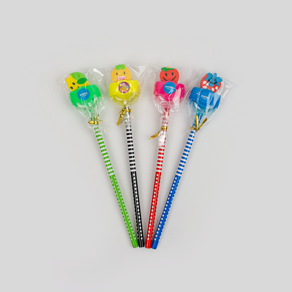 Lapiz HB con borrador y sacapuntas, contiene varios colores y modelos de borrador.
