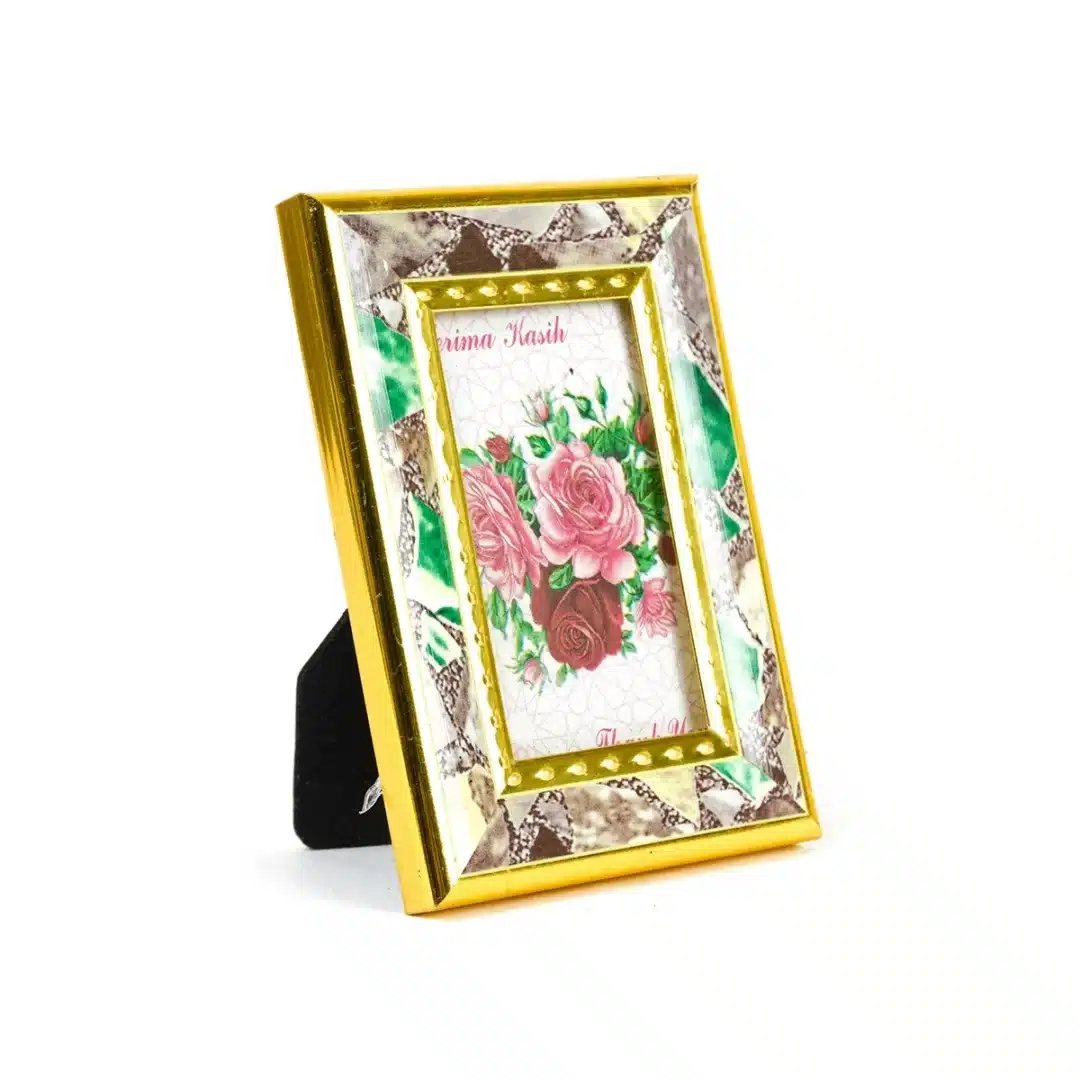 Mide 9 cm de alto x 6 cm de largo con una ventana de vidrio de 5,5 cm de alto por 3 cm de largo con un soporte trasero