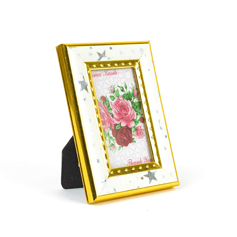 Mide 9 cm de alto x 6 cm de largo con una ventana de vidrio de 5,5 cm de alto por 3 cm de largo con un soporte trasero