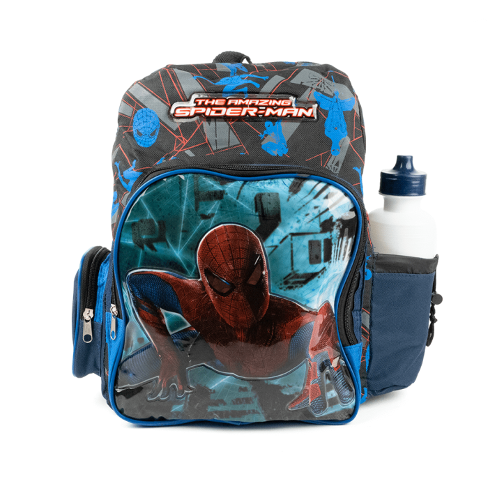 Mochila de spider-man contiene 4 servicios incluye un tomatodo. Mide 35cm x 35 cm x 14cm