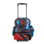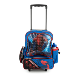 Mochila de spider-man con ruedas, tiene 4 servicios incluye un tomatodo. Mide 39cm x 37cm x 14cm, 70cm alto