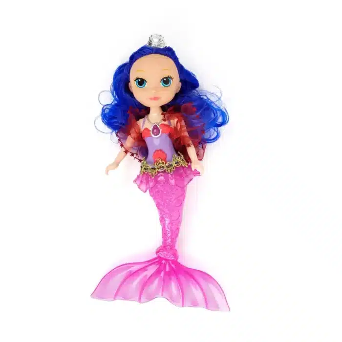 Se le presiona en el collar para que emita la canción: Debajo del mar. y se ilumine su cola con luz de led.