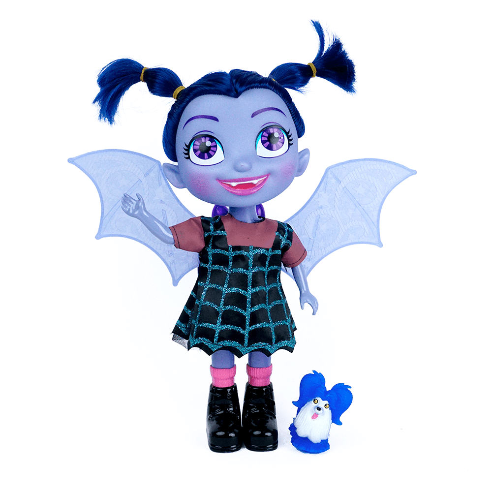 Muñeca Vampirina tiene alas de material plástico se pueden mover de manera manual presiona su pecho y tiene sonido musical cuenta con su amigo favorito un perro. Recomendado para niñas a partir de 3 años. Dimensiones:5,5 largo x 12 cm ancho x 26 cm altura