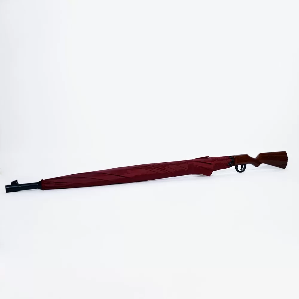 Paraguas con mango en forma de escopeta y su largo es de 90 cm, disponible en colores: vino, verde y negro.