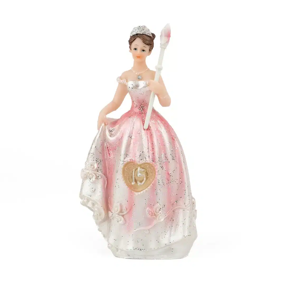 Quinceañera con sombrilla y tiene luz en el corazón de su vestido elaborada en poliresina.