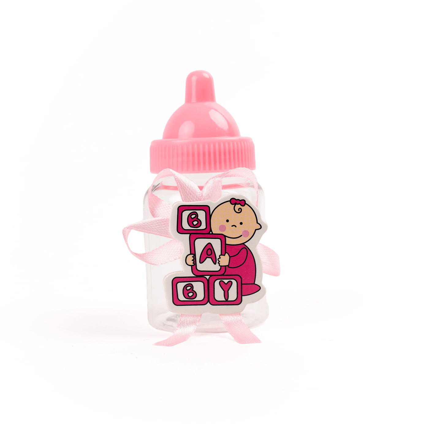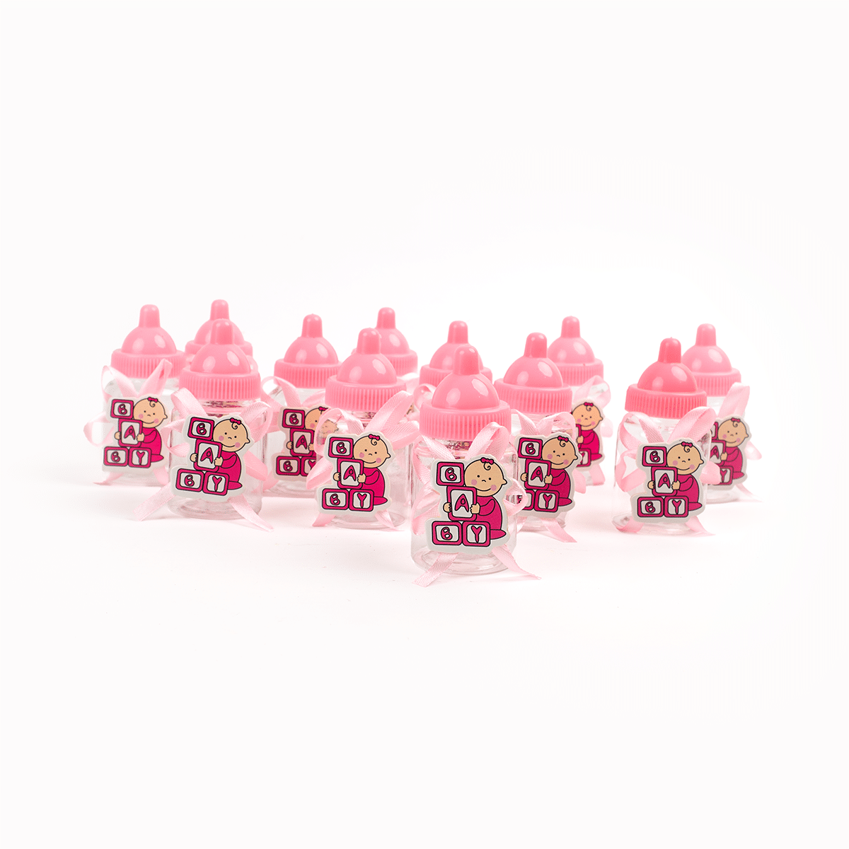 Set de recuerdos en forma de mini biberones con lazo de 12 unidades para baby shower.