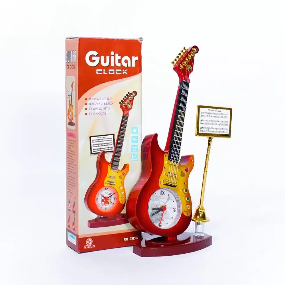 Elegante reloj despertador con forma de guitarra, ideal para adorno de oficina o para el hogar.