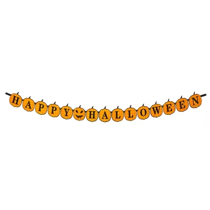 Da la bienvenida a tus invitados a tu fiesta con esta guirnalda,  viene impreso Happy Halloween" y una imagen de calabaza.
