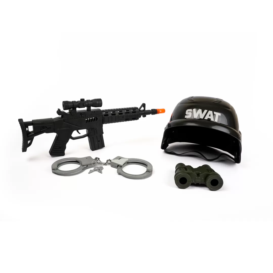 Contiene: Casco (1), arma (1), esposas (1), largavistas (binoculares) (1).
