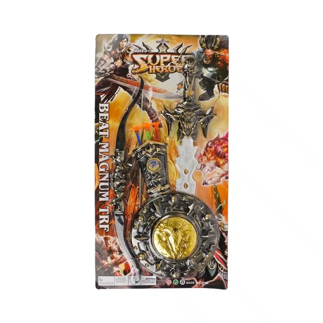 Contiene (7) piezas, arco (1), flechas (3) de colores: azul, verde y roja, guarda flechas (carcaj) (1), espada (1).