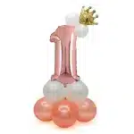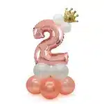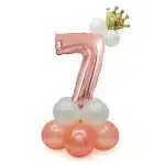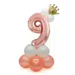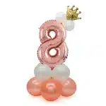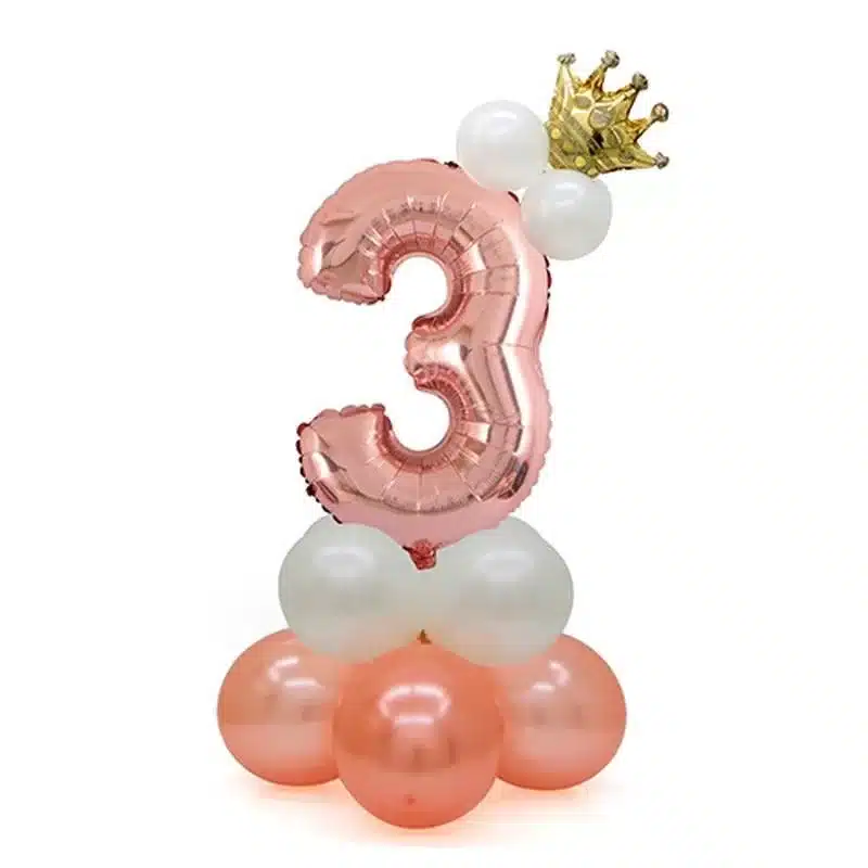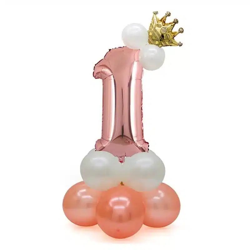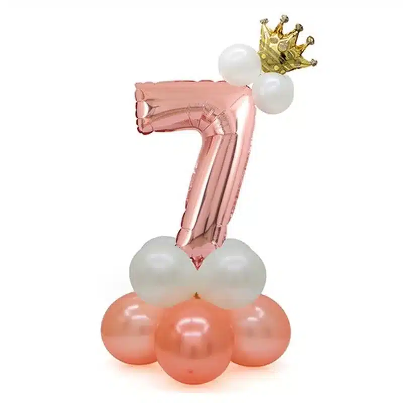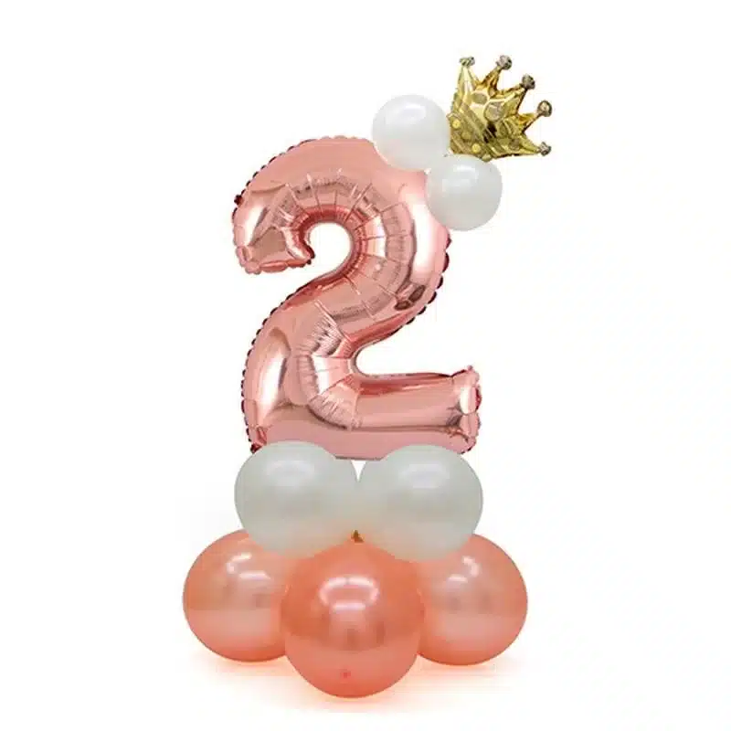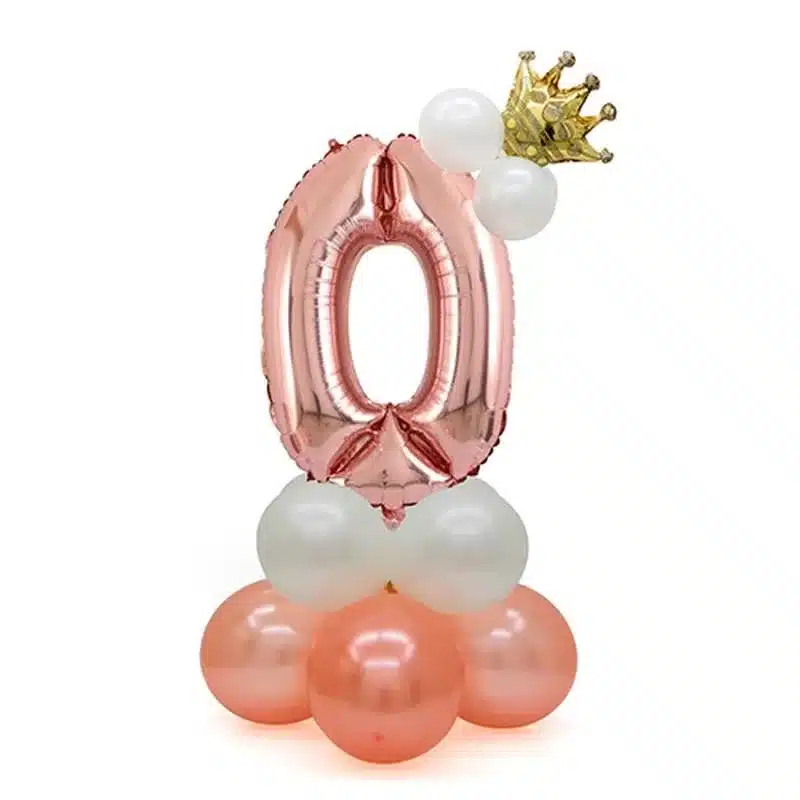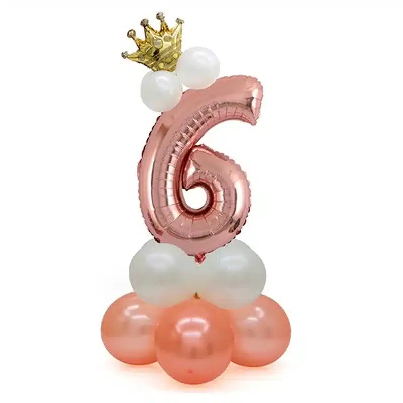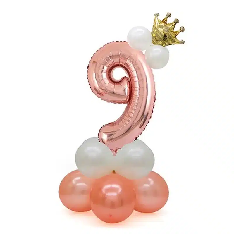 Incluye: 1 globo numérico de 32 pulgadas, 1 globo metálico de corona, 8 globos R9 color blanco y 4 globos cromados R12.