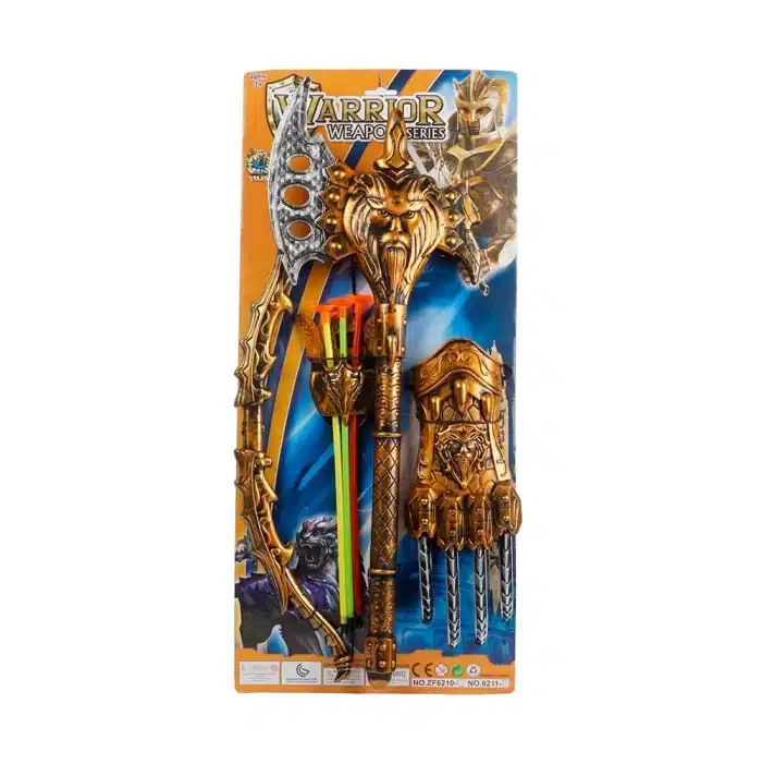 Contiene (7) piezas, arco (1), flechas (3) de colores: verde amarilla y roja (3), guarda flechas (carcaj) (1), hacha (1), guante para mano con garra (1). color dorado.