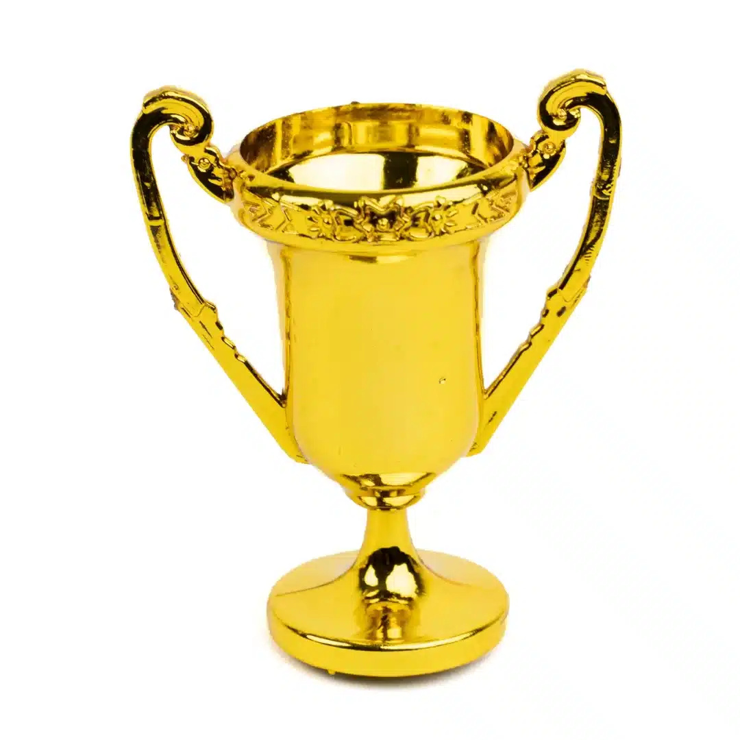 Set de 12 mini trofeos de plásticos color dorado.