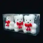 Set de 3 adornos ositos navideños, cada personaje lleva un collar plateado con un letrero de Merry Christmas. Ideal para complementar decoraciones navideñas o el arbolito de navidad.
