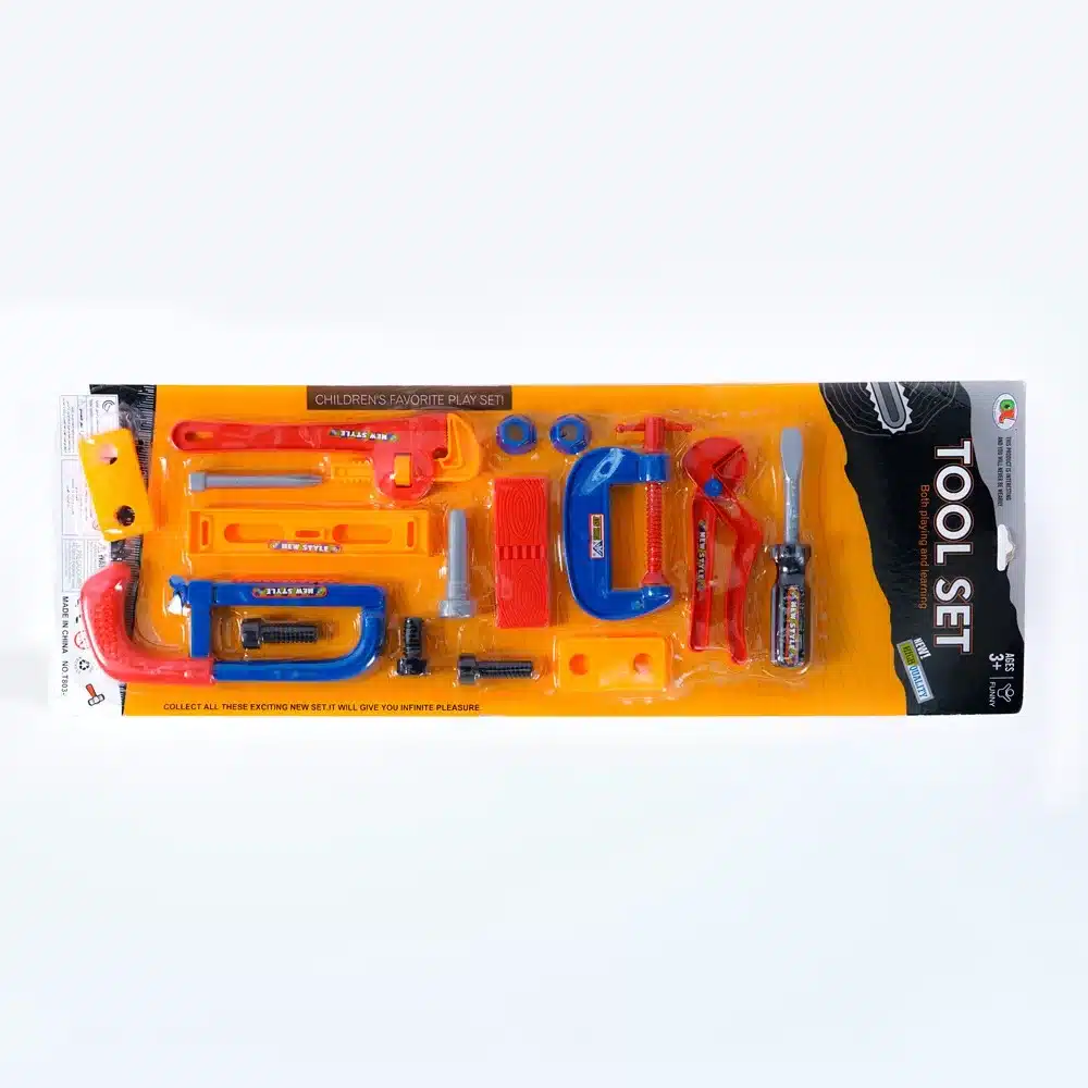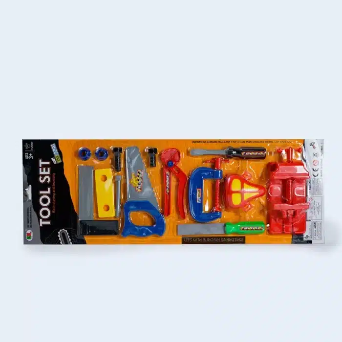 Incluye herramientas de juguete: destornillador, llave ajustable, sierra de mano, tornillos, clavos, martillo, etc.
