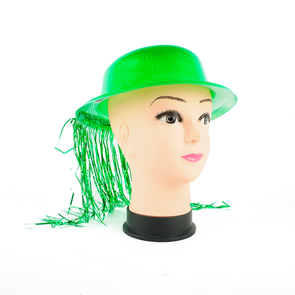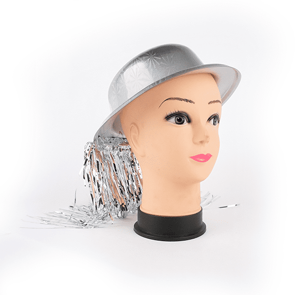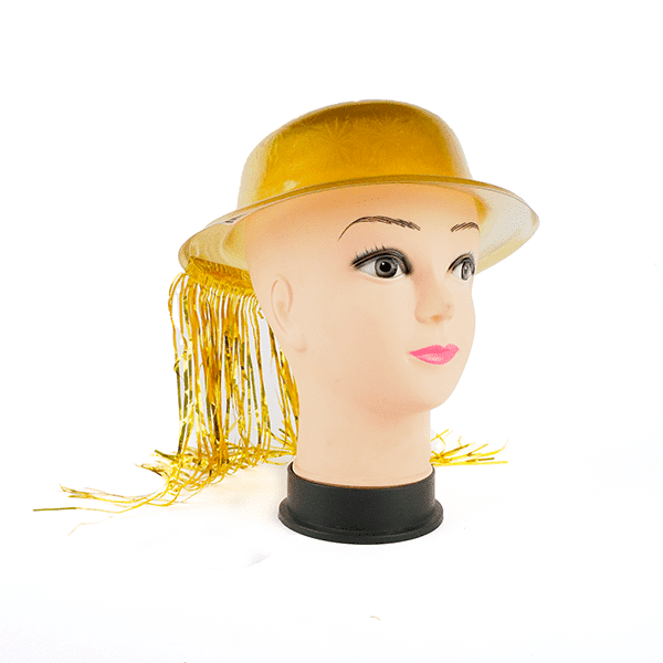 Sombrero de plástico con flecos de cinta metalizada copa redonda