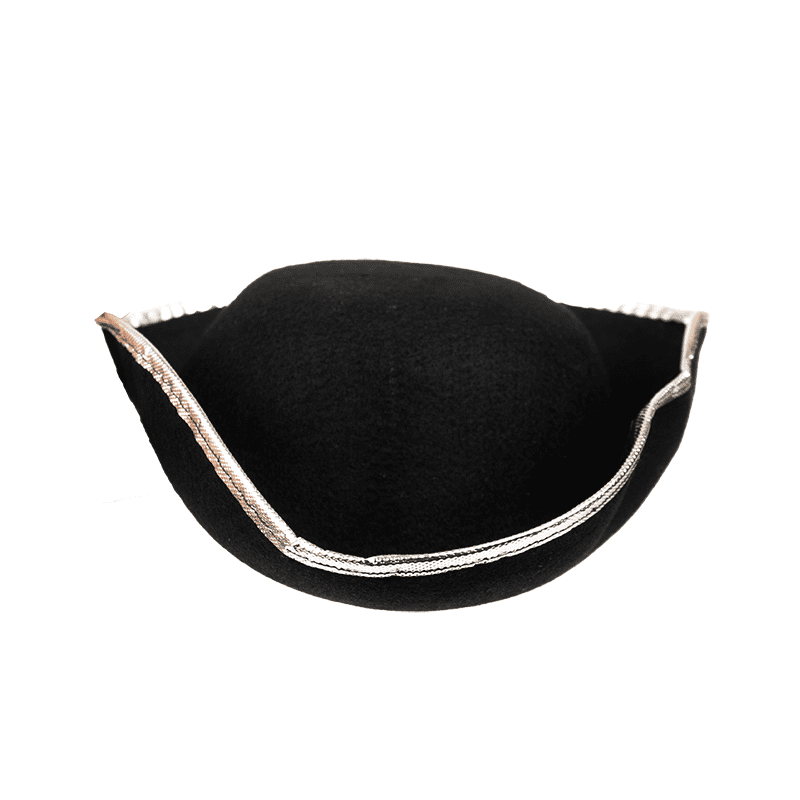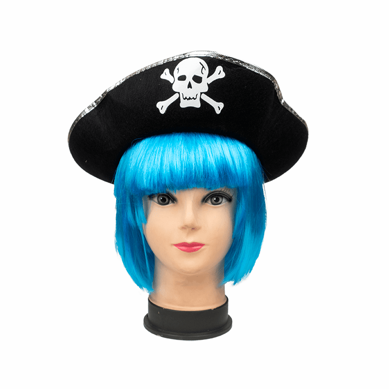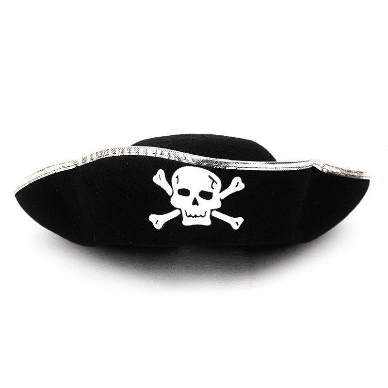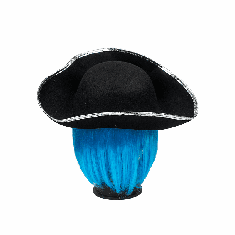 Sombrero negro de pirata perla negra en forma triangular con filo olateado y calavera.
