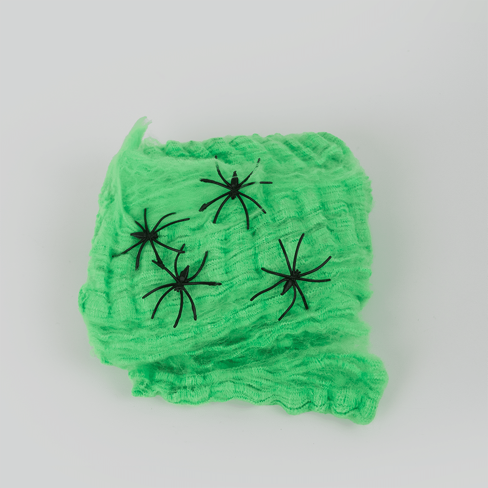 Telaraña color negro y verde con arañas, perfectas para decorar.