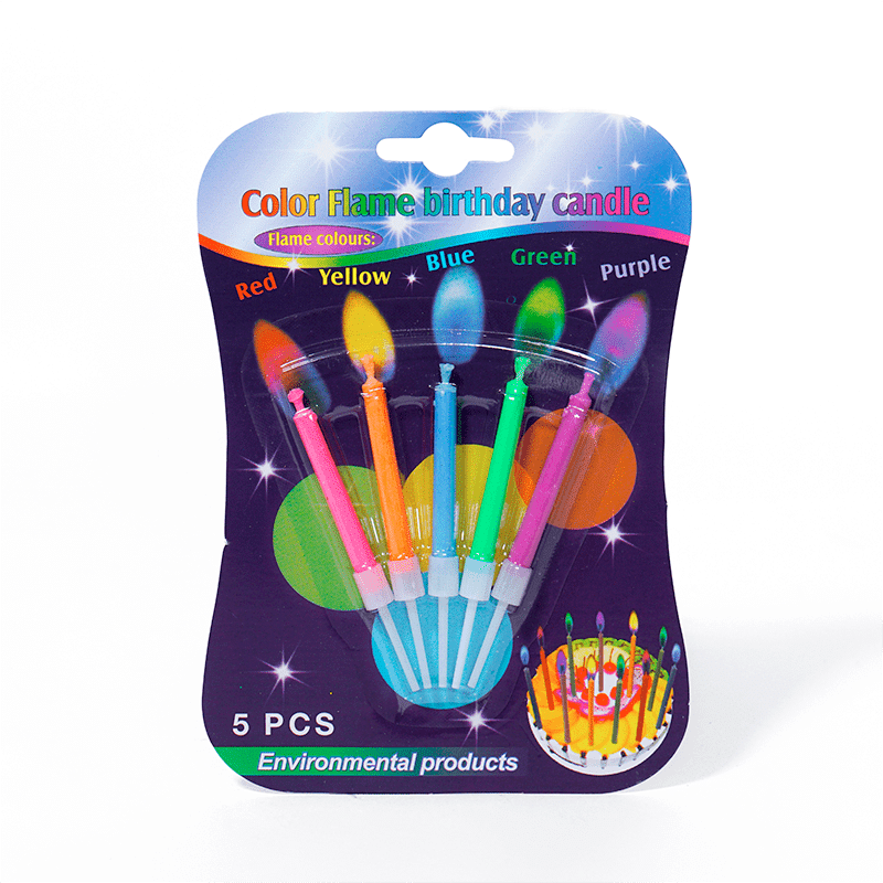 kit de 5 velas en colores brillantes, rojo, azul, amarillo, verde y morado 5cm de alto, tiene una duración de 11 minutos de iluminación por cada vela