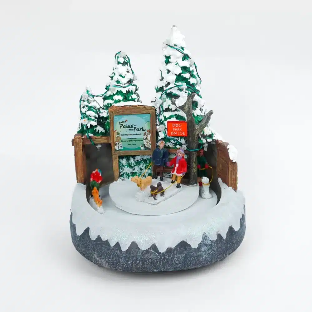 Adorno musical, Parque de mascotas navideño con escena de personas paseando sus mascotas en la nieve con movimiento giratorio, con luz LED blanca y música. Sus características funcionales son iluminación y movimiento funciona con 3 pilas AA (no incluidas). Interruptor de encendido/apagado en la parte trasera. Hecho de material de alta calidad, es un gran regalo para Navidad. Material: poli resina