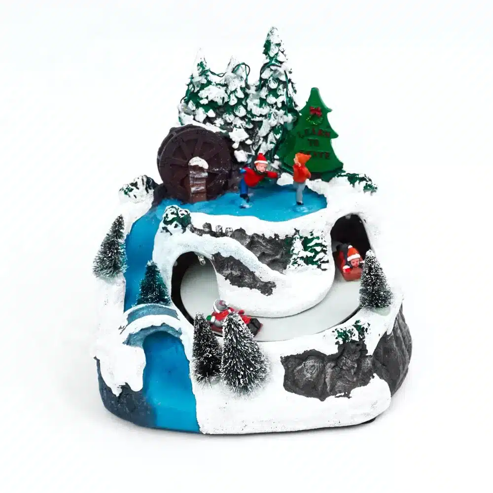 Adorno musical, con escena de niños lanzándose en la nieve. Complemento muy detallado para la decoración de tus navidades. Cuenta con una pareja de niños en movimiento lanzándose nieve y una pareja de adultos patinando sobre hielo de forma estática, decorado con árboles. Hecho de Material: poliresina, funciona con 3 pilas AA (no incluidas). Interruptor de encendido/apagado en la parte trasera
